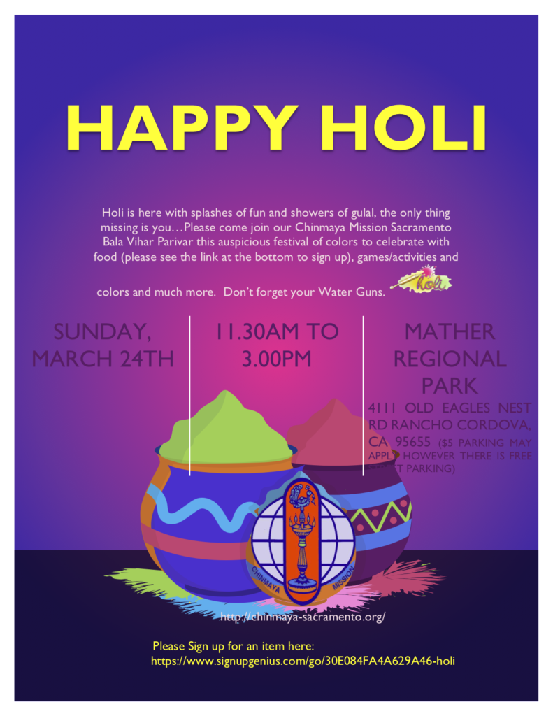 Celebrate Holi with Chinmaya Mission Sacramento Family Share this: Share on X (Opens in new window) X Share on Facebook (Opens in new window) Facebook Related