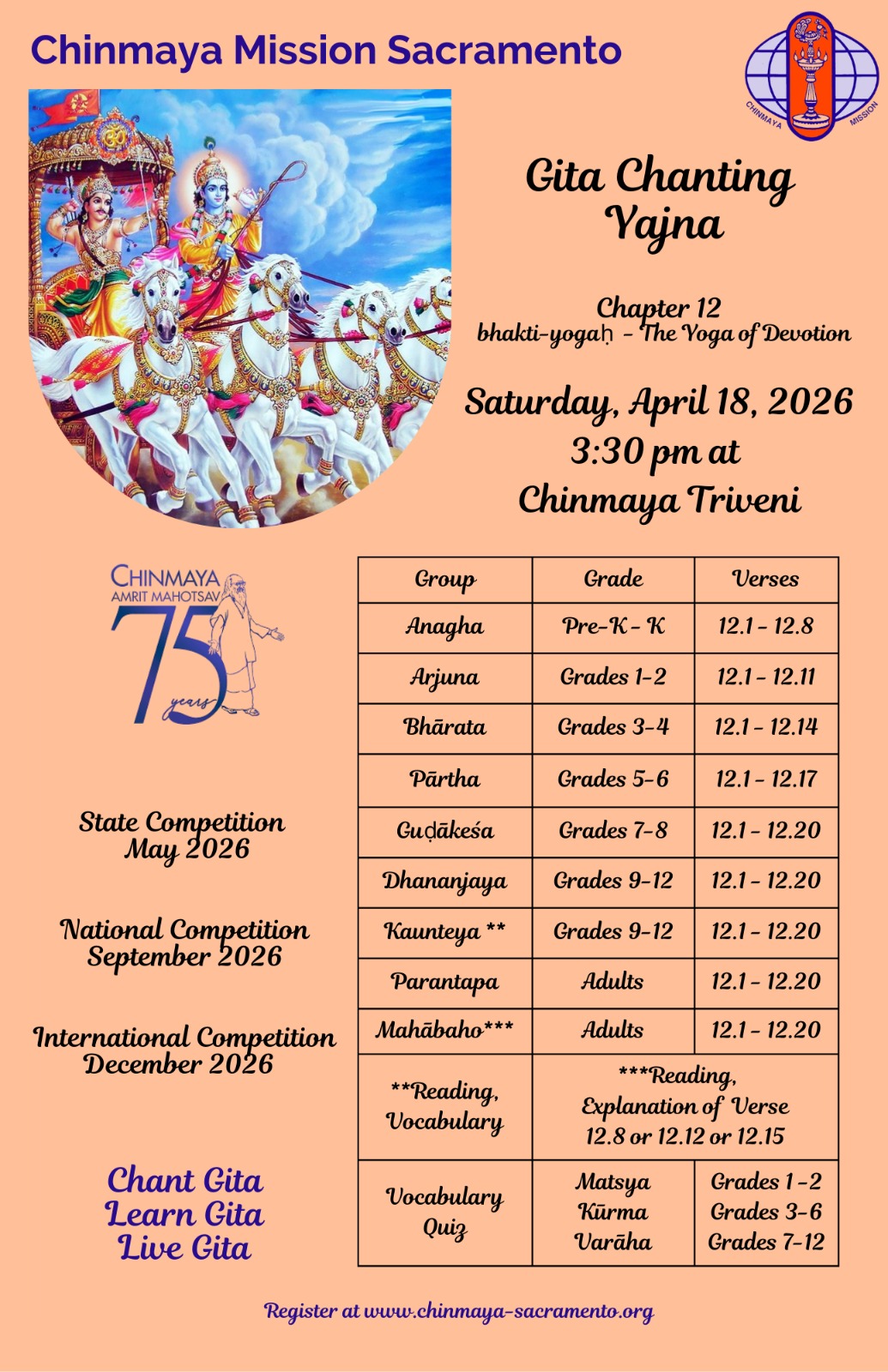 Gita Chanting Yajna 2026 Click Here to Register Click here for Gita Chanting Resources Scroll down for evaluation criteria document Evaluation Criteria PDF is below Share this: Share on X (Opens in new window) X Share on Facebook (Opens in new window) Facebook Related