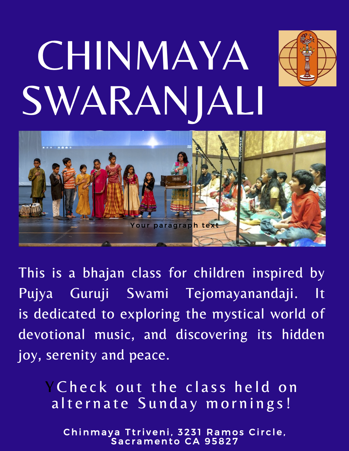 Inspired by the melodious renderings of hymns by Pujya Swami Tejomayanandaji and the soulful bhajans sung by the Swaranjali wings of the various centers, Chinmaya Mission Sacramento is glad to offer Swaranjali classes in our community from the 2011-2012 year.